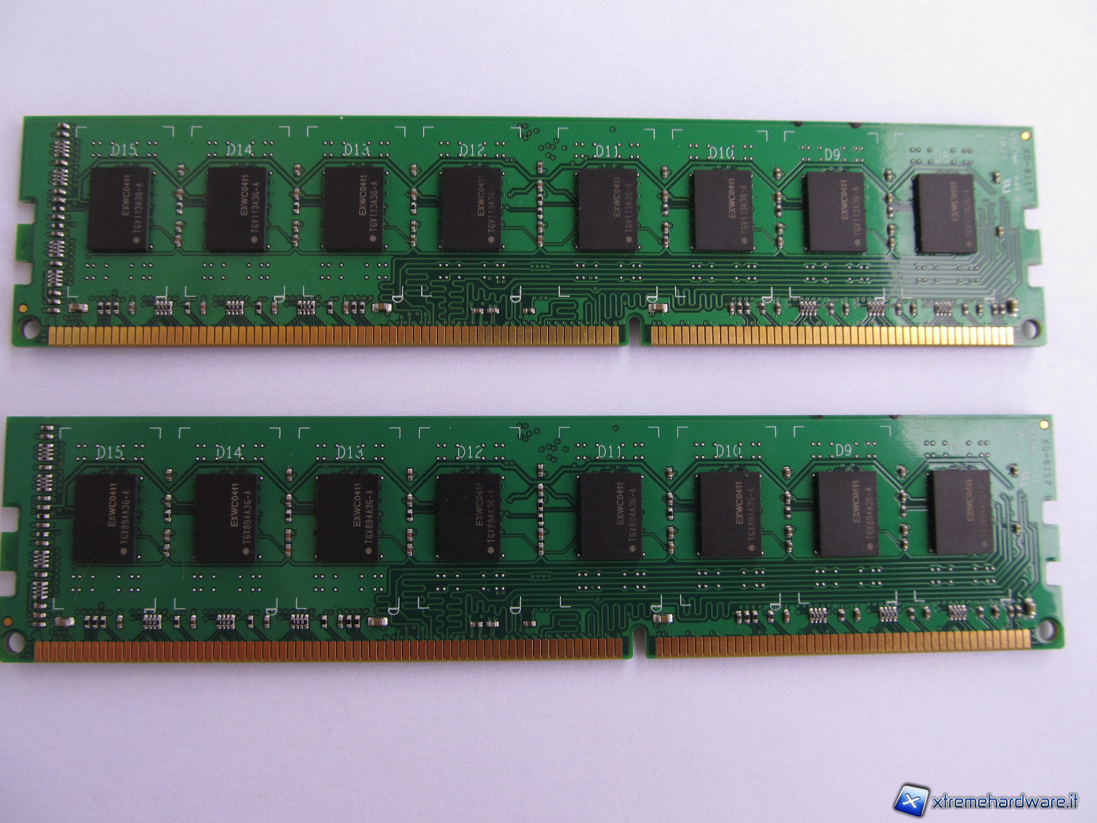 Trattandosi di moduli di memoria di tipo “Value” le Exceleram EP3001A si presentano sprovviste di qualsiasi sistema di dissipazione di calore, quindi come possiamo vedere i moduli sono caratterizzati dal classicissimo PCB di color verde comprendente 8 chip di memoria per lato.