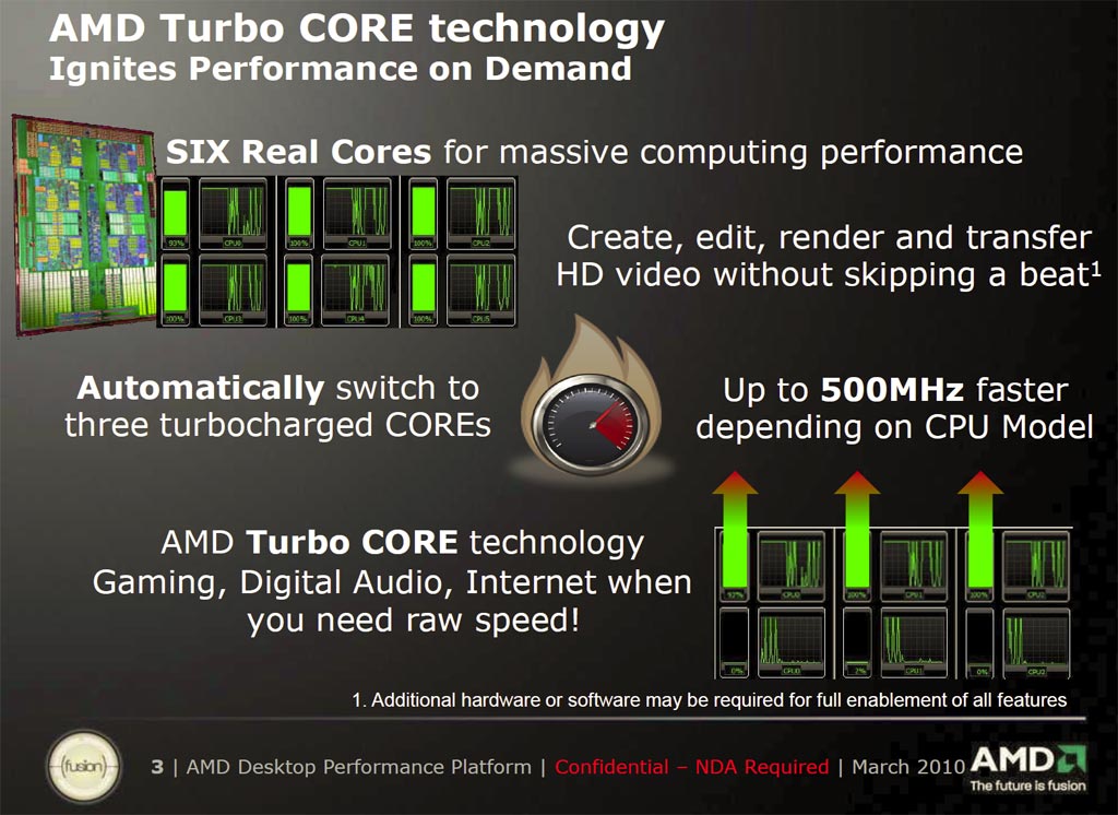 AMD ha implementato una tecnologia simile a quella introdotta da Intel sulle proprie cpu, si tratta della funzionalità Turbo Core che permette di incrementare la frequenza di alcuni core se si presentano certe situazioni di idle degli altri core. Nei modelli 1090T permette di incrementare la frequenza sino a 3.6 GHz quando 3 core rimangono in stato di idle. Tutto questo avviene in automatico, senza che l’utente debba fare alcuna operazione.