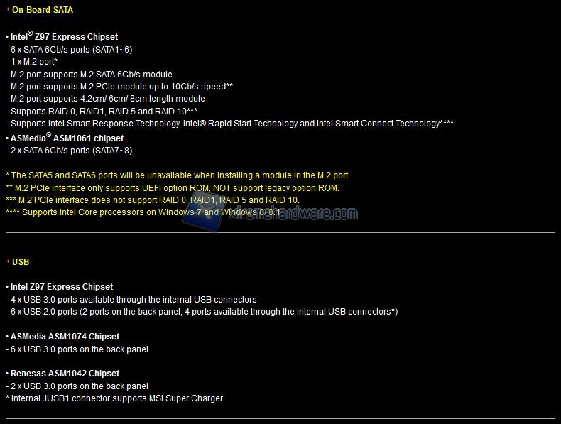 Tra le specifiche rilevanti di questa scheda madre, occorre menzionare il support al 3-way CrossFire grazie ai tre slot PCI Express, anche se consigliamo per schede video top di gamma come le AMD R9 290X di optare per schede madri dotate di switch PLX o comunque in grado di garantire una bandwidth su ogni scheda di almeno 8x. Dato infatti che la scheda supporta tre schede video solo in configurazione x8/x4/x4, il 3-way SLI non può essere supportato, come da specifiche NVIDIA. La connettività come già visto è completa, abbondante è il numero di porte per i dispositivi di storage, e la mancanza del SATA Express può essere colmata con l’adattatore opzionale per lo slot M.2.